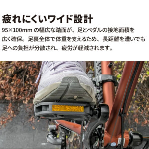 100×95mmの幅広踏面により足裏全体で体重を支え、長距離走行でも疲労が分散されやすいとのこと。