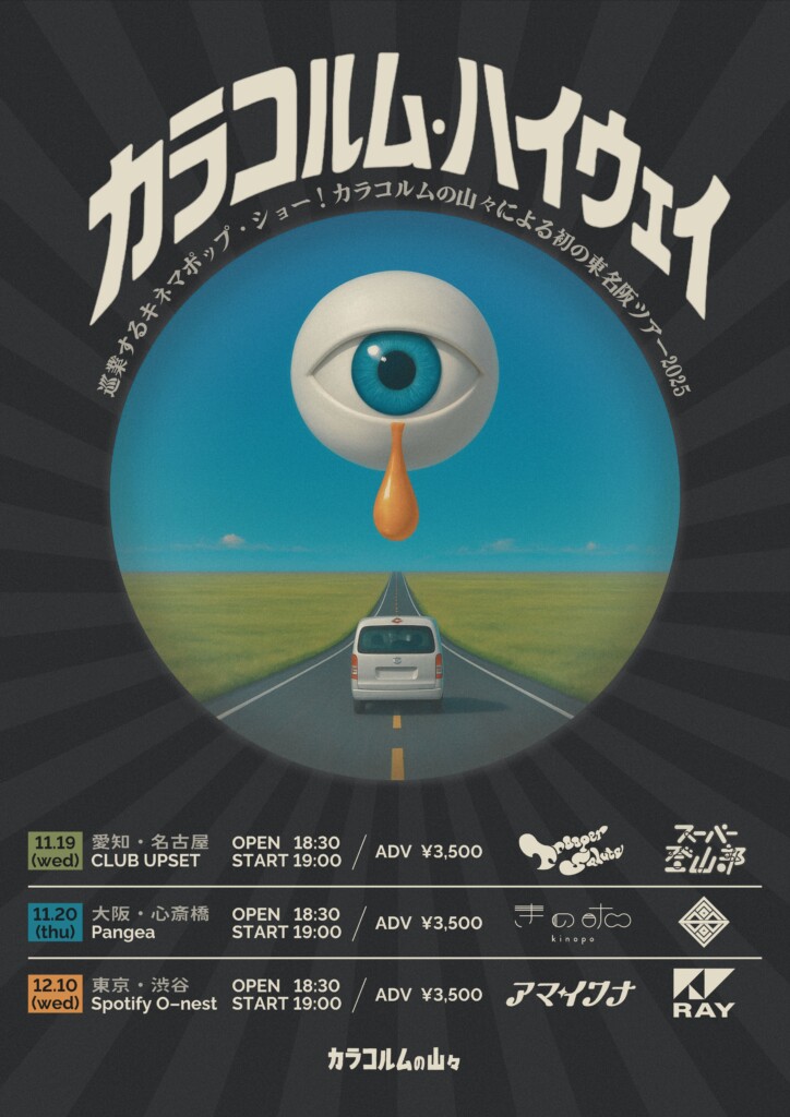 「カラコルムの山々」は、ポップとアンダーグラウンドの境界線を軽やかに行き来するバンドとして、近年のインディーシーンで独自の存在感を放っている。 今回のツアーは、単なるライブイベントではなく“巡業するキネマ・ポップショー”として企画され、各地で異なる文脈の音楽が交差する。バンドの芸術性とユーモアを体感できる重要な節目となりそうだ。