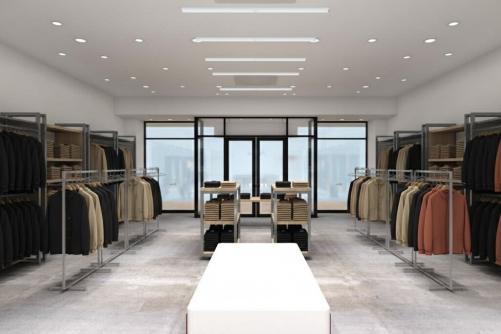 店内には、ナンガ本社工場を想起させる インダストリアルテイストの什器 を採用。